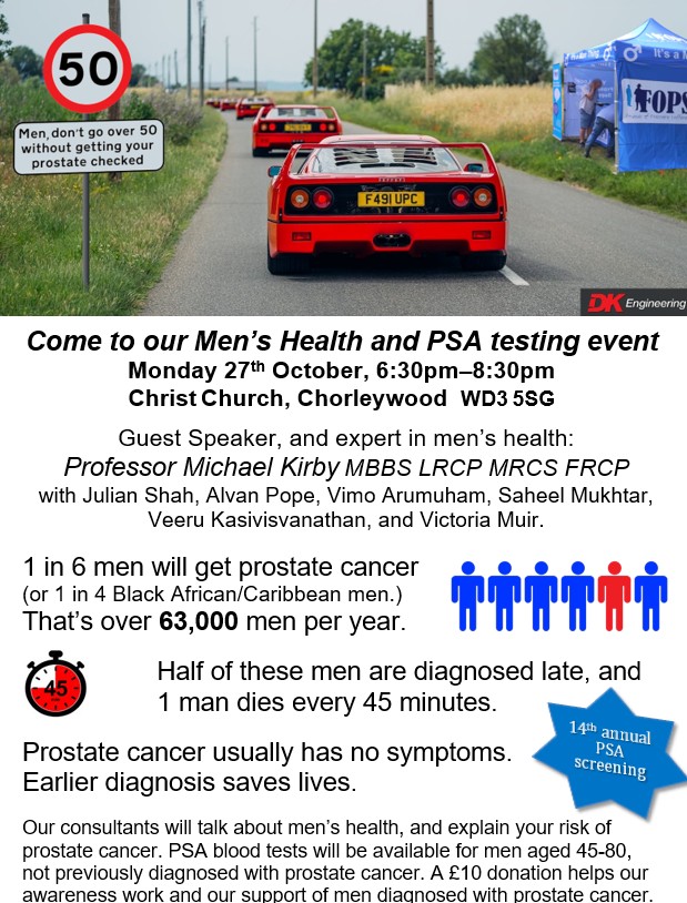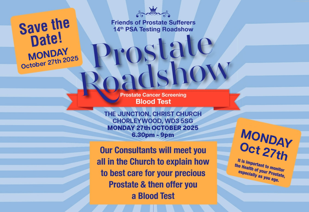 From 6.30pm until 9pm we will be hosting our 14th PSA Testing Roadshow at Christ Church in Chorleywood (WD3 5SG) on October 27th 2025.